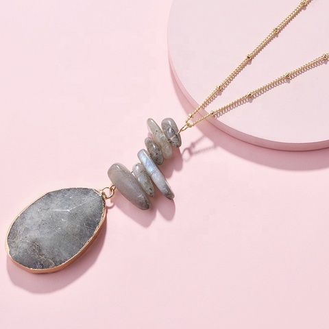 女性と男性のためのDakingゴールドメッキロングチェーンナチュラルラブラドライトストーンペンダントネックレス