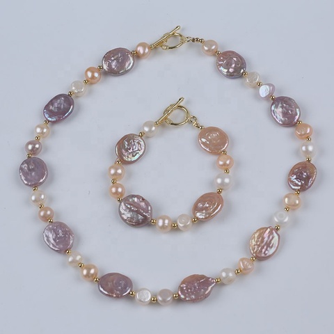Natural água doce branco rosa roxo cor misturada moeda pérola colar pulseira jóias conjunto para as mulheres